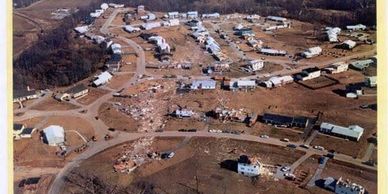 Aerial photo shows the path of destruction when a tornado ripped through River Bend January 24, 1967. Luckily, everyone in River Bend survived.